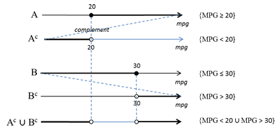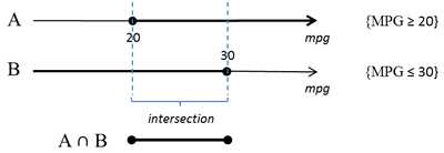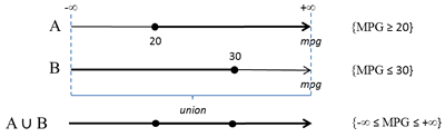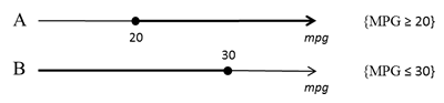 4. In an experiment of Measuring Miles Per Gallon, group A of cars accomplished results of at least 20 mpg and group B made up to 30 mpg. Using the interval notation the sets can be defined mathematically as A = [20,∞) and B = (-∞,30].